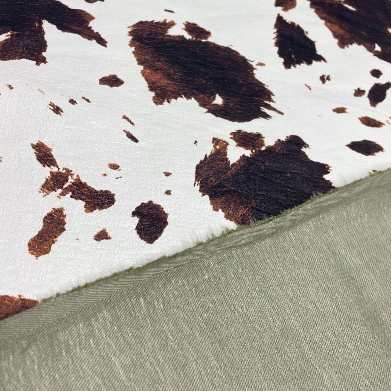 Один из самых актуальных принтов с рисунком имитирующим кожу коровы. Достаточно мягкая и приятная на ощупь. Выполнена заливным способом на основную поверхность ткани - подложки. Не тянется. Прекрасно подойдет для пошива юбок, брюк, курток и т.п. Так же как элемент декора на изделия.